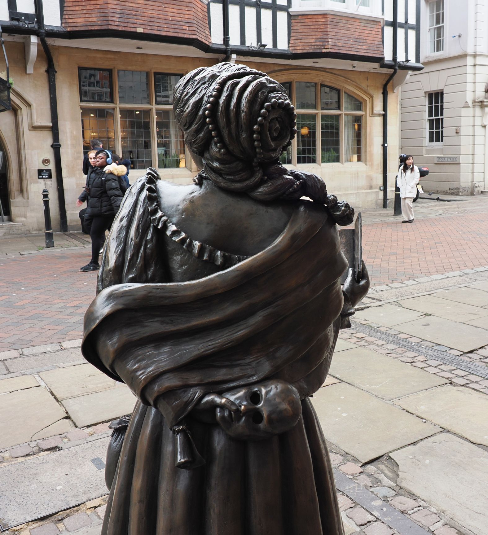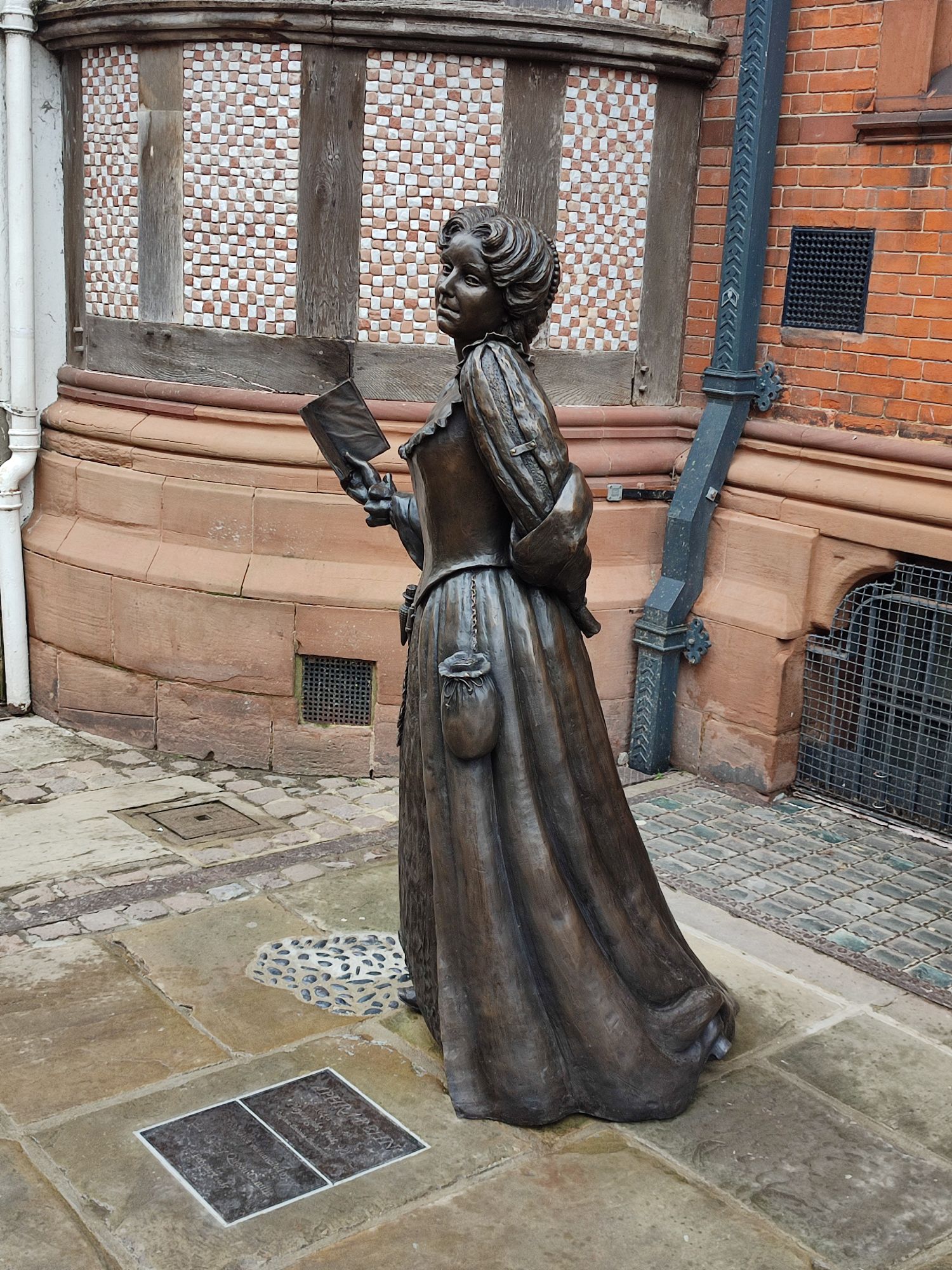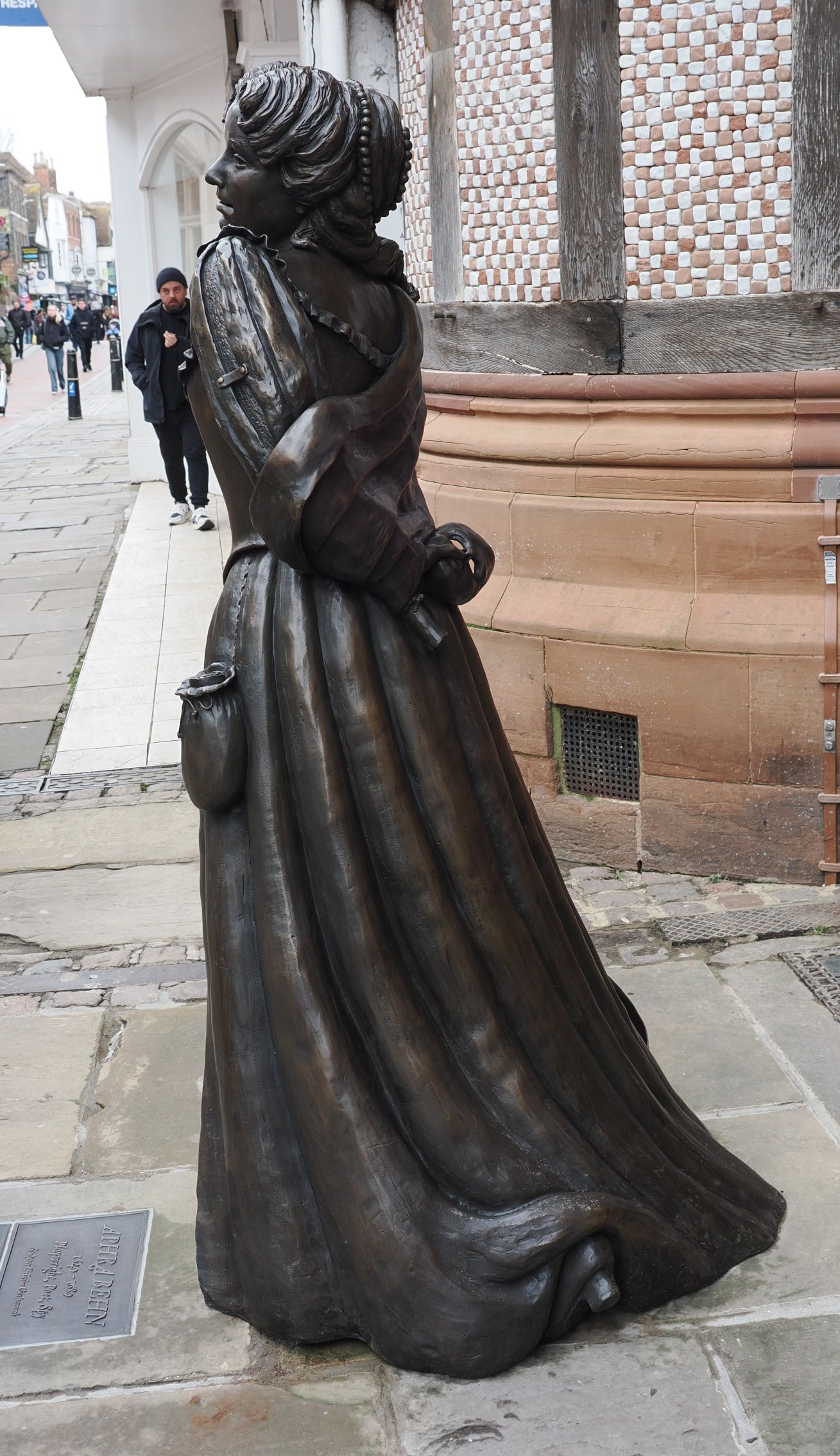 I chose to depict Aphra at the age she was when she left Canterbury. As this was before her great achievements there are many clues about her future life all around her figure. She was the first English woman to earn her living by her pen and she always had the means to write with her. She was also a spy for the King. During the restoration period she had more plays staged than any other playwright. She published poetry and prose work, including her important book, Oroonoko. She was a bold, confident, multi-talented woman and an early champion of women’s rights.
